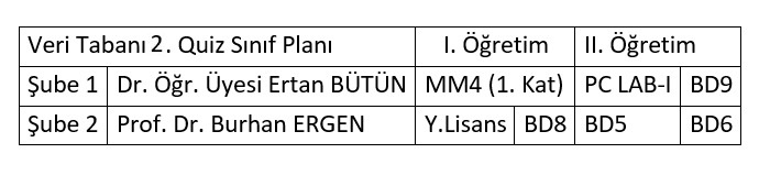 16 Aralık 2025 Salı günü saat 11:00’de yapılacak olan Veri Tabanı Yönetim Sistemleri dersi 2. Quiz sınavı, aşağıda belirtilen sınıflarda gerçekleştirilecektir.