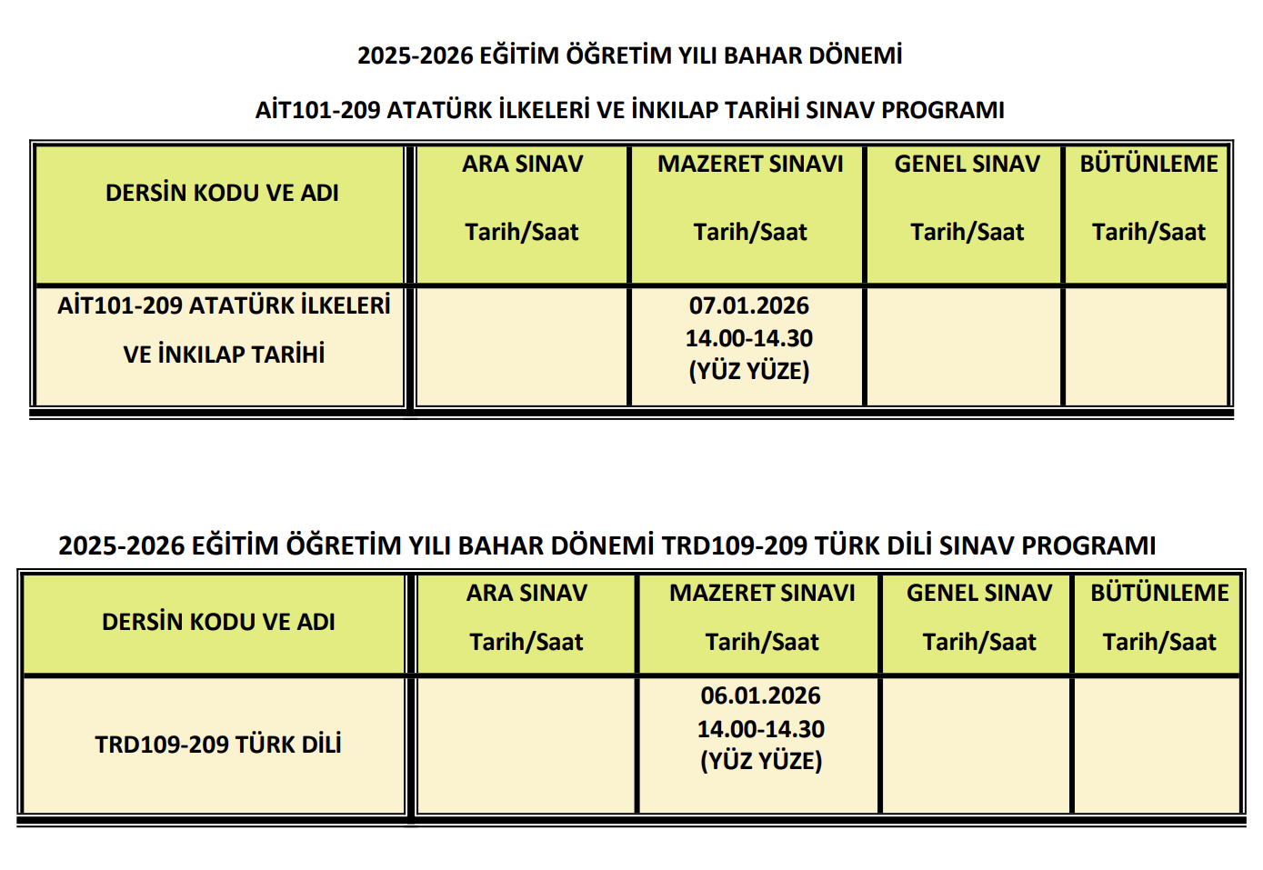 2025-2026 Eğitim-Öğretim Yılı Bahar Yarıyılında yapılacak olan TRD109-TRD209 kodlu Türk Dili ile AİT101-AİT209 kodlu Atatürk İlkeleri ve İnkılap Tarihi dersinin mazeret sınavı aşağıda belirtilen tarihte, İnsan ve Toplum Bilimleri Fakültesi A2 Dershanesinde yapılacaktır.