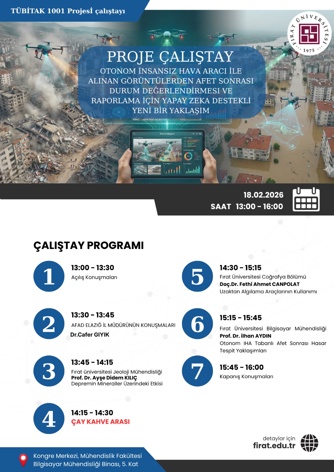 Fırat Üniversitesi Bilgisayar Mühendisliği Bölümü Öğretim Üyesi Prof. Dr. İlhan AYDIN yürütücülüğünde devam eden TÜBİTAK 1001 projesi kapsamında “Otonom İnsansız Hava Aracı ile Alınan Görüntülerden Afet Sonrası Durum Değerlendirmesi ve Raporlama İçin Yapay Zeka Destekli Yeni Bir Yaklaşım” başlıklı çalıştay düzenlenecektir. Afet sonrası hasar tespiti, uzaktan algılama teknolojileri ve yapay zeka tabanlı analiz yaklaşımlarının ele alınacağı çalıştayda, alanında uzman akademisyenler ve kurum temsilcileri bilgi ve deneyimlerini paylaşacaktır.