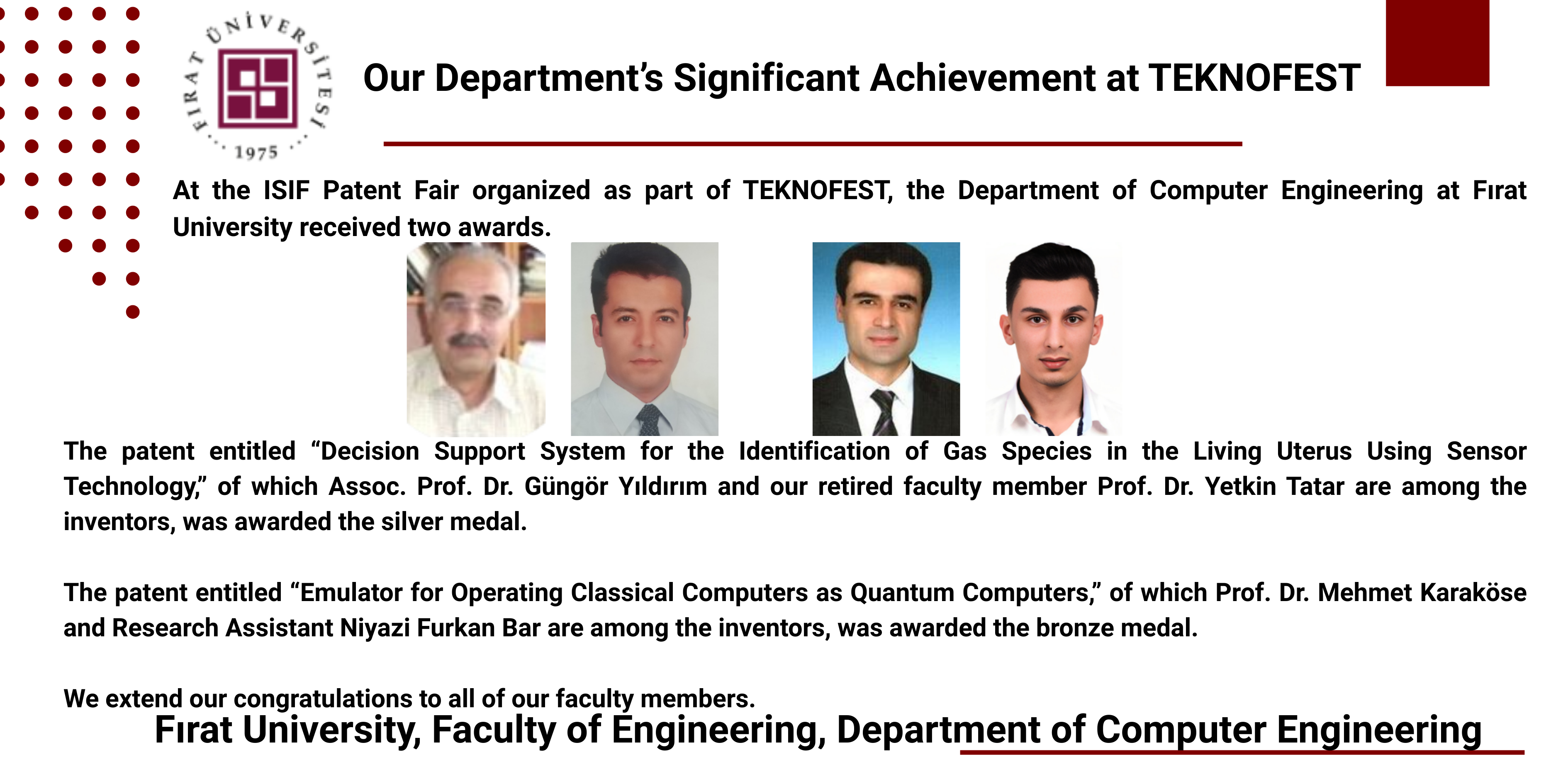 At the ISIF Patent Fair organized as part of TEKNOFEST, the Department of Computer Engineering at Fırat University received two awards.